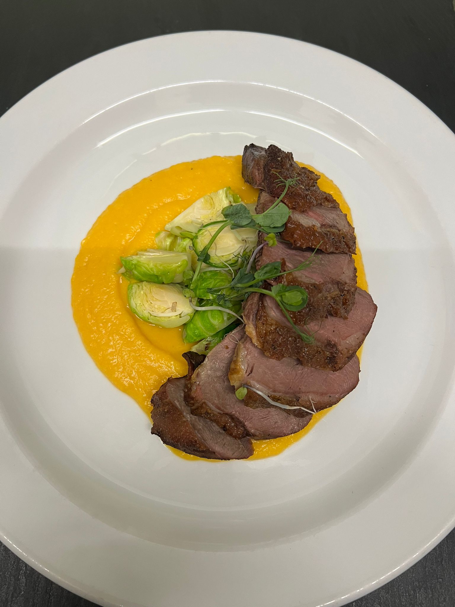 300g Grilované husí prso s růžičkovou kapustou a pyré z pečené dýně 319,-